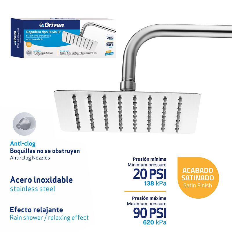REGADERA TIPO LLUVIA DE 8" ACERO INOXIDABLE CUADRADA