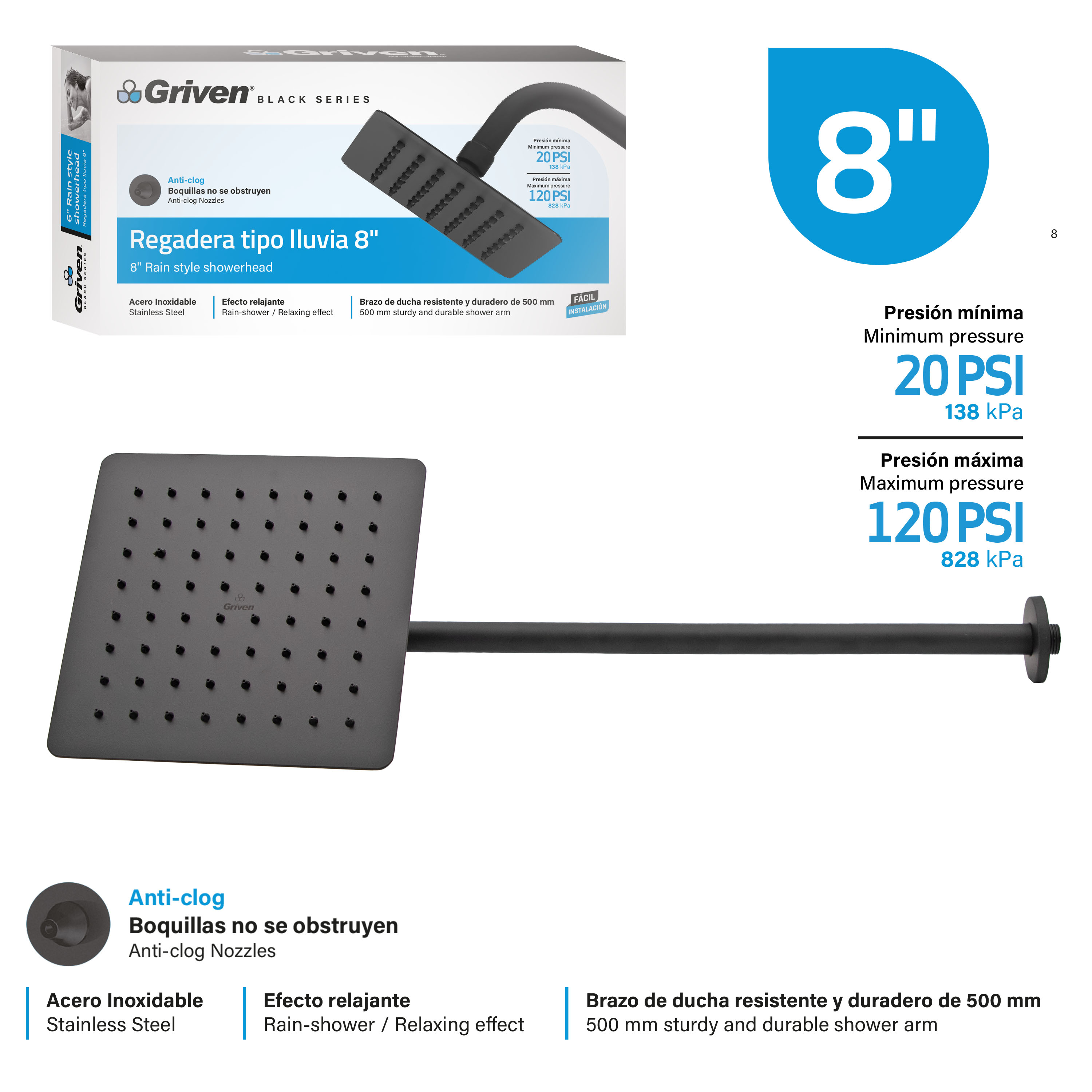 REGADERA TIPO LLUVIA DE 8" NEGRA CUADRADA