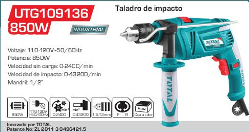 •Mandril: 1/2” (13 mm) con llave, compatible con brocas de 1.5 mm a 13 mm