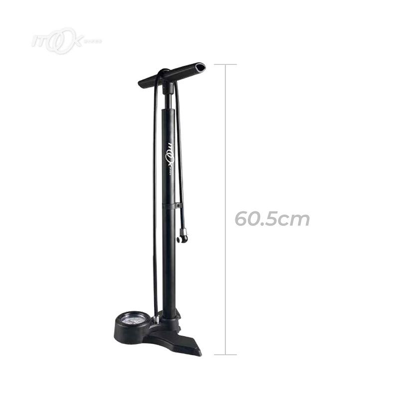 Bomba de piso CNC de aluminio, color negro, 150 PSI. Infla tus llantas con precisión.