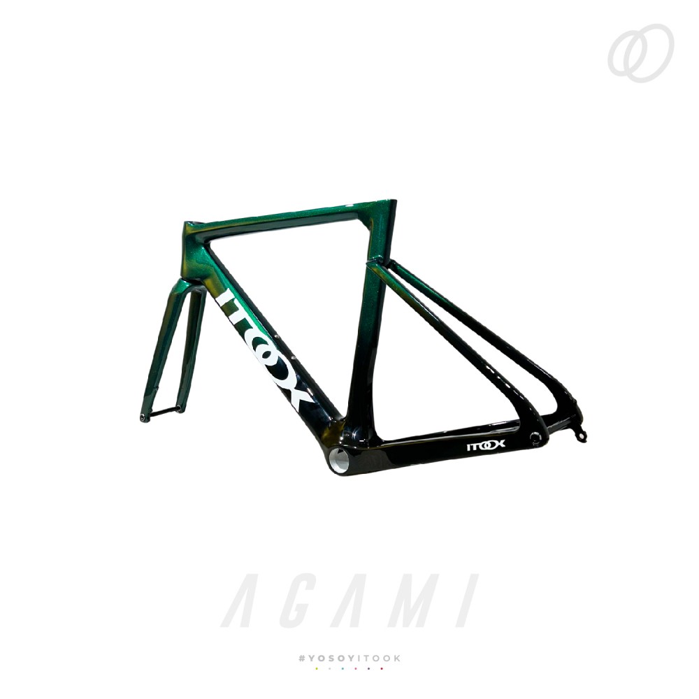 Marco de ruta Agami color negro/verde M (510) con tenedor de carbono, para frenos de disco. 3 años de garantía. Envío a Bogotá y toda Colombia.