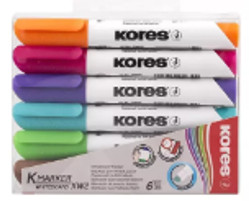 Marcador borrable set x6 W2 Kores, colores brillantes, ideal para oficinas y escuelas.