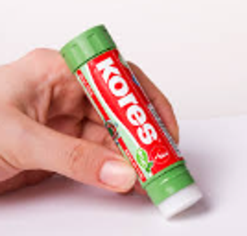 Pegante barra 20 grs Kores ecológico, adhesivo seguro, sin solventes, ideal para proyectos.
