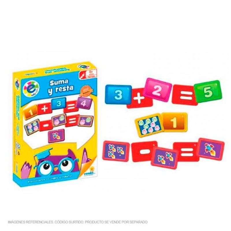 Juego educativo para practicar sumas y restas con fichas coloridas.