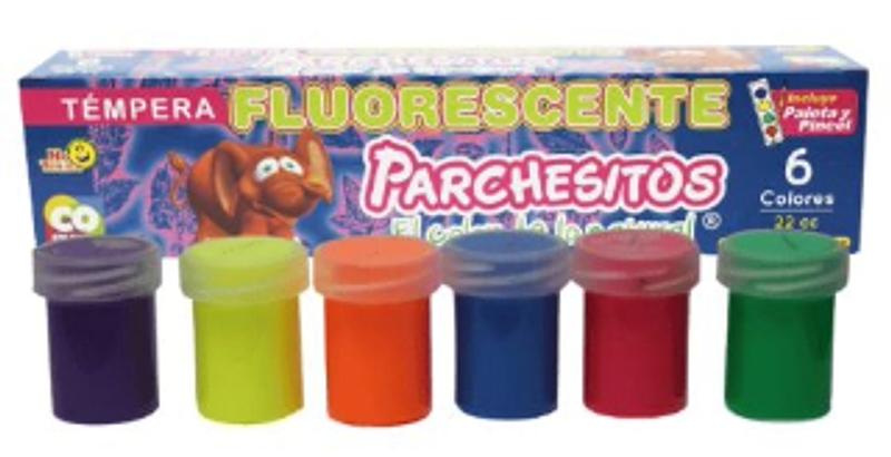 Tempera X6 Fluorecente Parchesitos seis colores vivos y vibrantes, diseñados para resaltar en cualquier tipo de proyecto artístico