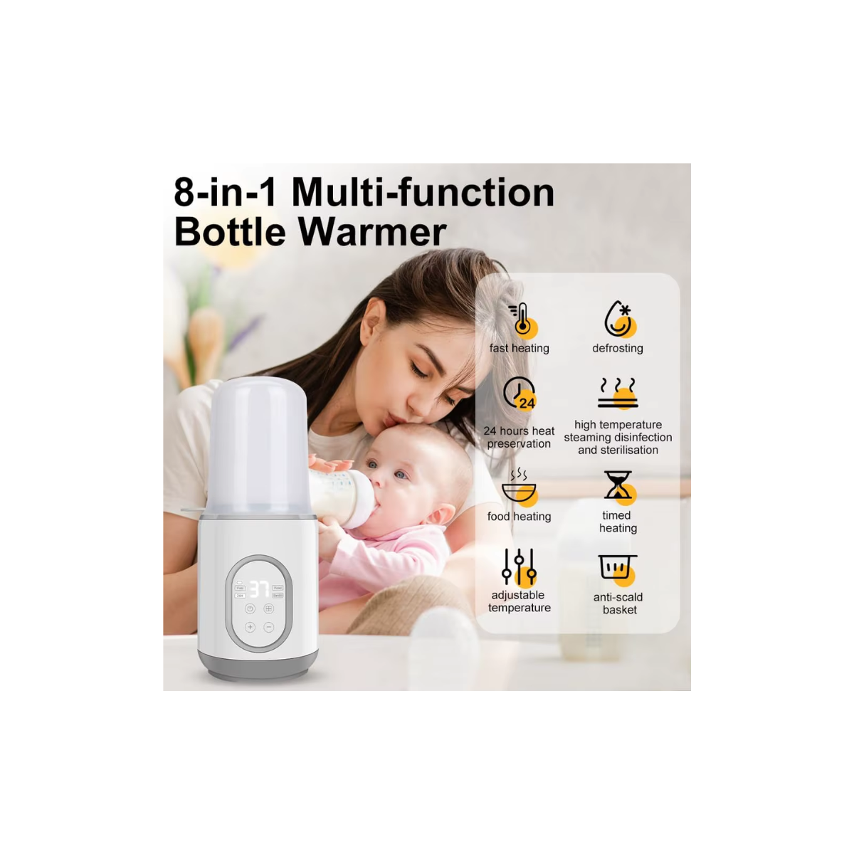 El calentador de biberones multifuncional está diseñado para ofrecer comodidad, seguridad y rapidez en la alimentación del bebé. Su sistema inteligente mantiene la temperatura estable y uniforme, evitando el sobrecalentamiento. Compatible con la mayoría de botellas del mercado, permite calentar leche, fórmula o alimentos en pocos minutos.