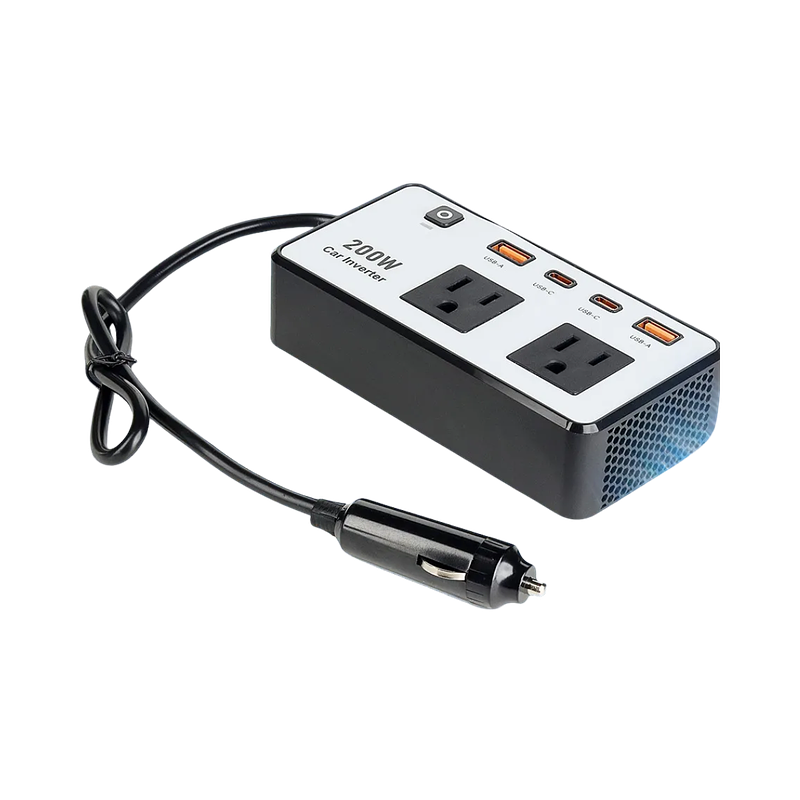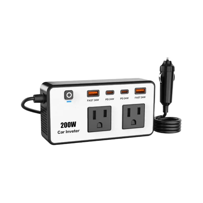 Inversor de corriente 200W con 2 salidas AC y 3 puertos USB de carga rápida, seguro y portátil para tus dispositivos.