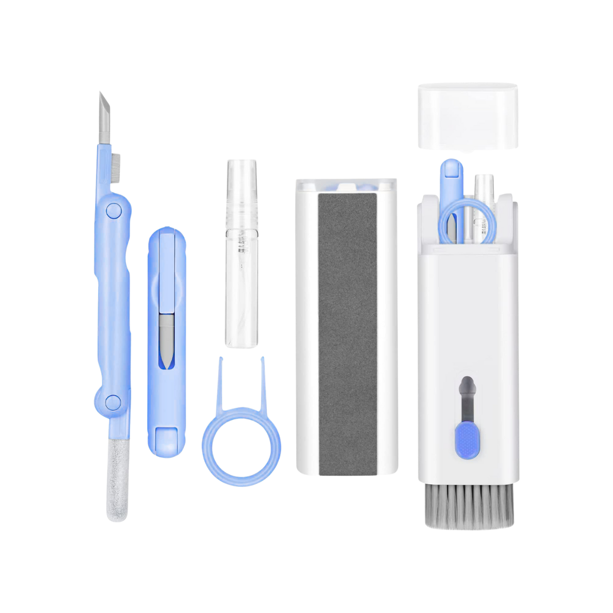 7 en 1: Herramienta de limpieza todo en 1 para laptop y auriculares, incluyendo bolígrafo de limpieza para Airpod con clip de silicona, clip de plástico, esponja flocada y cepillo, spray de solución de limpieza de pantalla, cepillo retráctil de teclado de alta densidad con paño de microfibra, llavero y paño de limpieza de gafas de felpa suave.