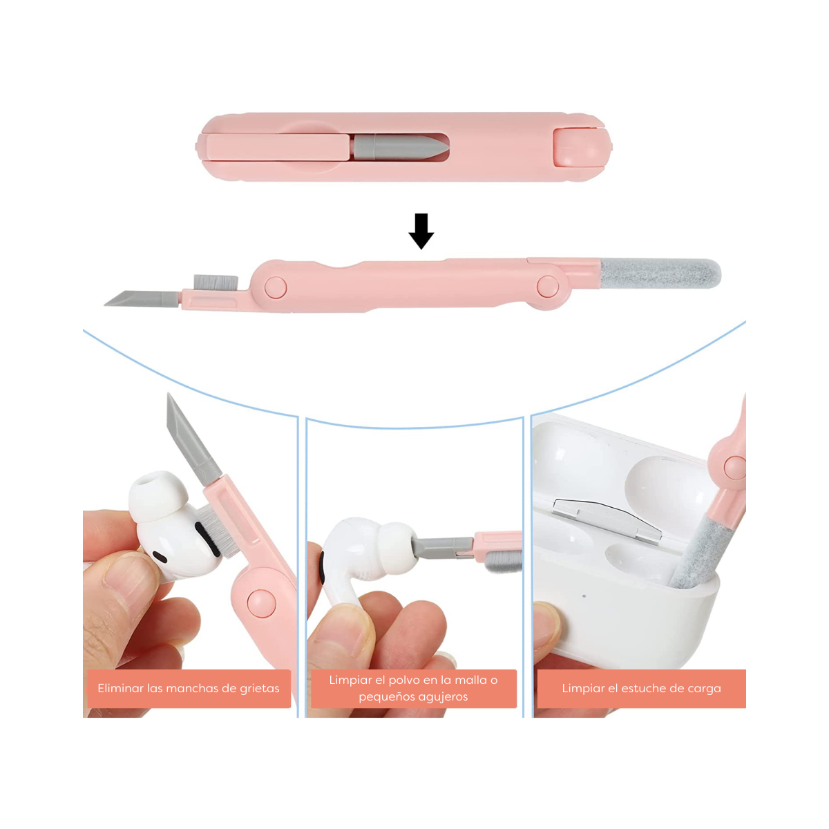 Innovador bolígrafo de limpieza plegable: es muy conveniente y rápido de limpiar la suciedad pegajosa y dura oculta entre grietas y agujeros en auriculares, smartphones, tabletas, portátiles, teclados, etc. Con clips de plástico cuando se utilizan bolígrafos de limpieza de silicona, además de spray de solución de limpieza, el efecto de limpieza es mejor