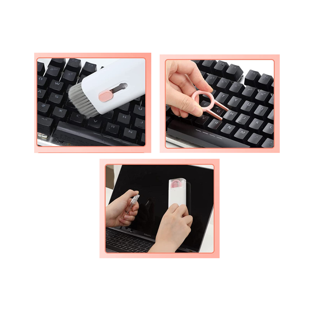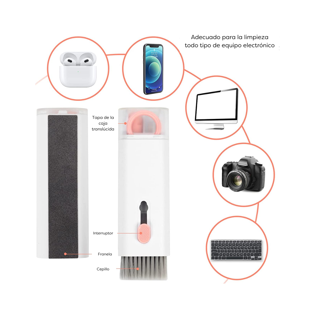 7 en 1: Herramienta de limpieza todo en 1 para laptop y auriculares, incluyendo bolígrafo de limpieza para Airpod con clip de silicona, clip de plástico, esponja flocada y cepillo, spray de solución de limpieza de pantalla, cepillo retráctil de teclado de alta densidad con paño de microfibra, llavero y paño de limpieza de gafas de felpa suave.