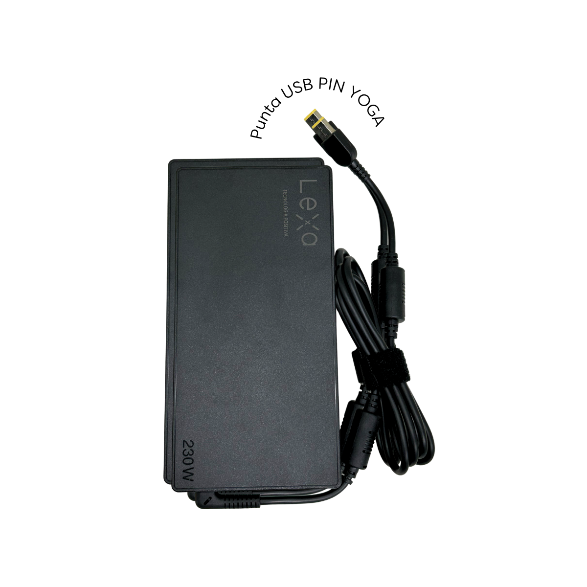 Cargador 230W 20V 11.5A con conector USB PIN, ideal para laptops de alto rendimiento, carga rápida y segura.