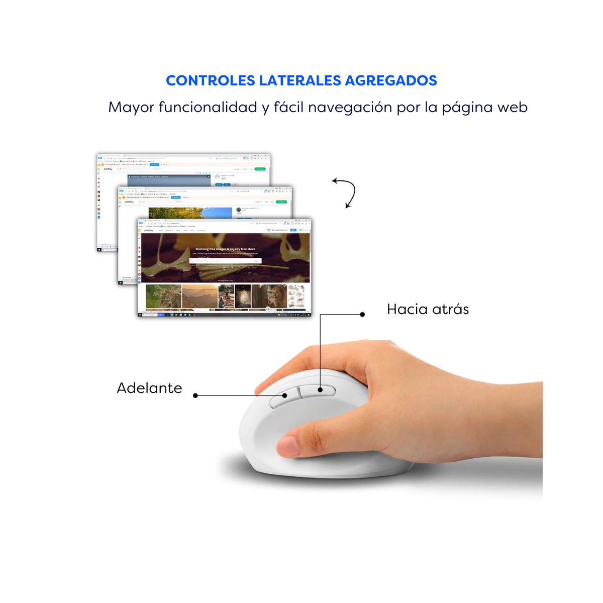Mouse inalámbrico vertical diseñado ergonómicamente para mantener la mano en una posición natural, ayudando a reducir la fatiga y la tensión en muñeca y brazo. Su diseño cómodo permite un uso prolongado sin molestias, ideal para trabajo, estudio u oficina en casa. Ofrece control preciso, manejo suave y libertad total sin cables, brindando una experiencia más saludable y eficiente durante el día a día.