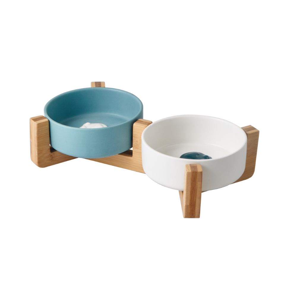 Comedero doble con base de madera.