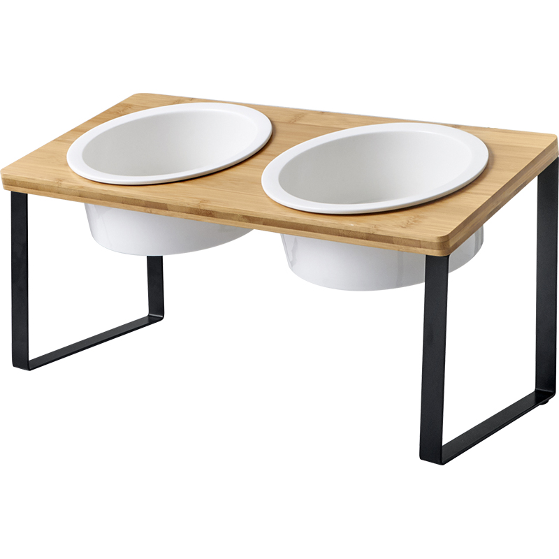 Comedero elevado con base de madera. Altura ajustable y tazas en porcelana