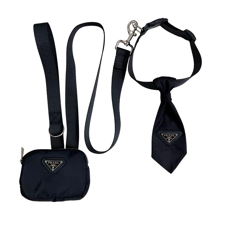 pañoleta corbatín Prada negra con correa para paseo y bolso.