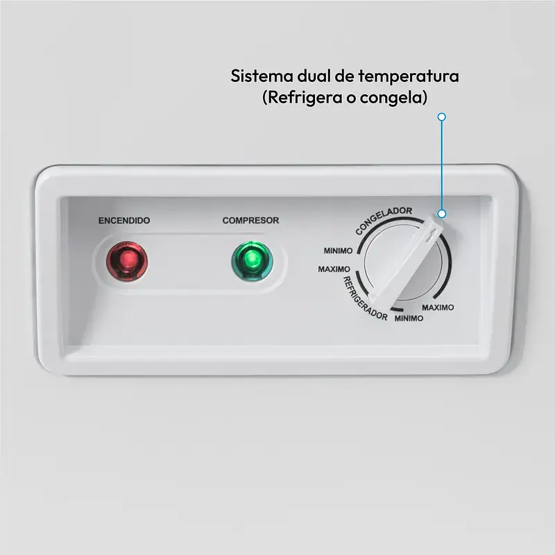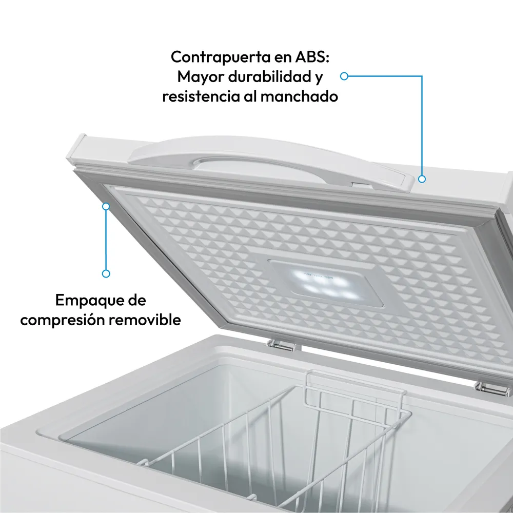 Este congelador está diseñado pensando en tu seguridad y la protección de tus alimentos. Su puerta con manija externa plástica y chapa de seguridad garantizan un cierre firme y confiable, manteniendo el contenido resguardado frente a accesos no deseados. Ideal para hogares y negocios que valoran el control y la tranquilidad.