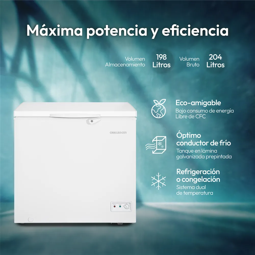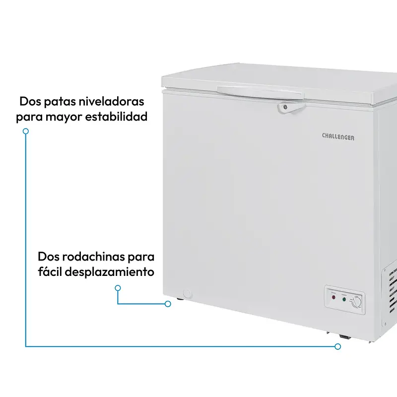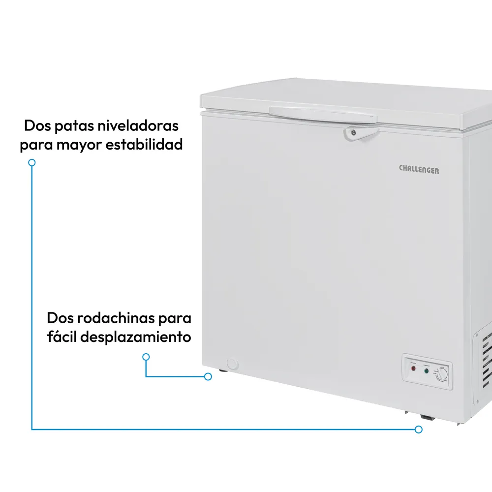 El Congelador Horizontal Challenger de 204 litros ofrece una solución práctica y segura para conservar tus alimentos. Su diseño incluye chapa de seguridad, dos patas niveladoras y dos rodachines que facilitan su movilidad. Está construido con lámina galvanizada prepintada tanto interna como externamente, lo que garantiza durabilidad. Incorpora condensador interno para una limpieza más sencilla, sistema dual de temperaturas (refrigerador y congelador), empaque de compresión removible, iluminación LED, bajo nivel de ruido y una canastilla resistente para una mejor organización. Ideal para hogares que buscan eficiencia y versatilidad.
