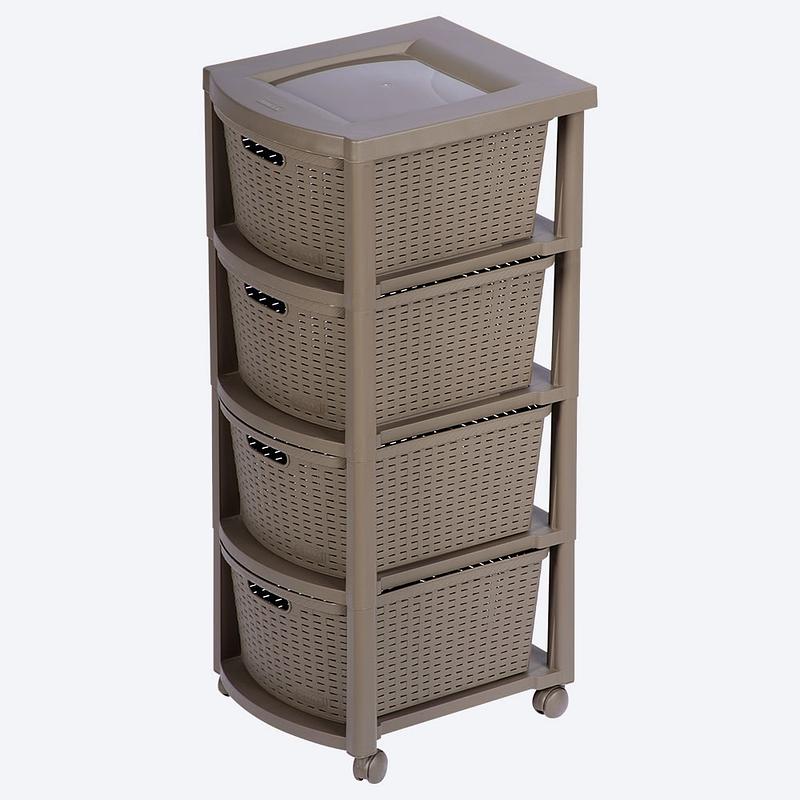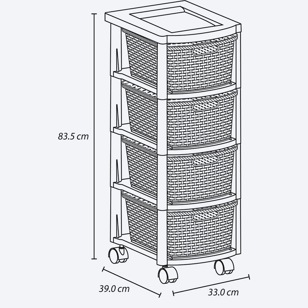Cajonero con apariencia Rattán con 4 gavetas, las canastas cuentan con una capacidad de 12 Litros.