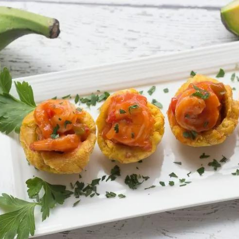 Coctel de camarones en salsas, al mejor estilo pacifico sobre 3 canastillas de plátano crocante.