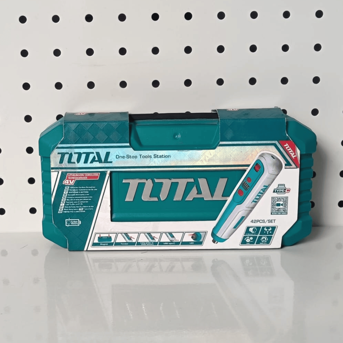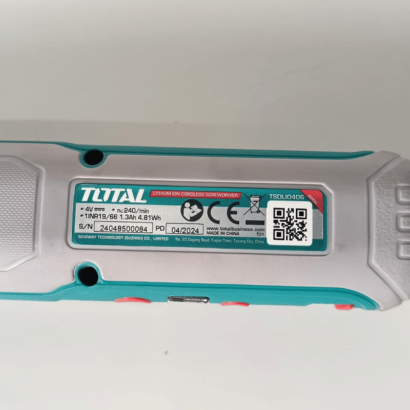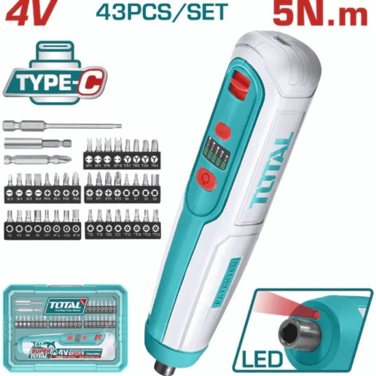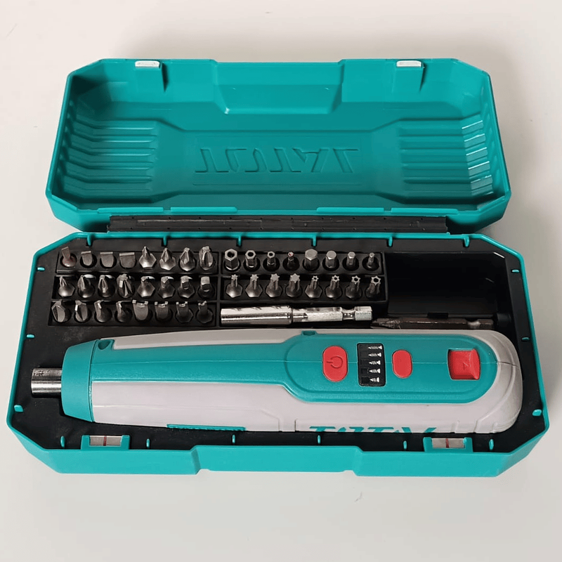 Atornillador Total 4V 5Nm + caja plástica 43 piezas. potencia, practicidad y diseño compacto para ensamblajes rápidos y precisos en cualquier entorno