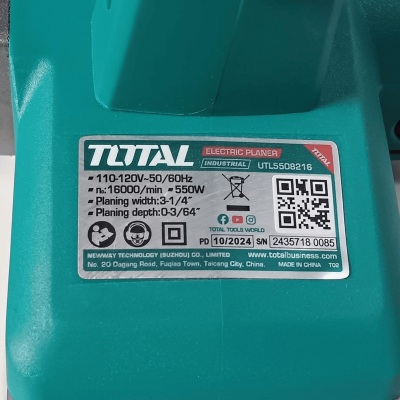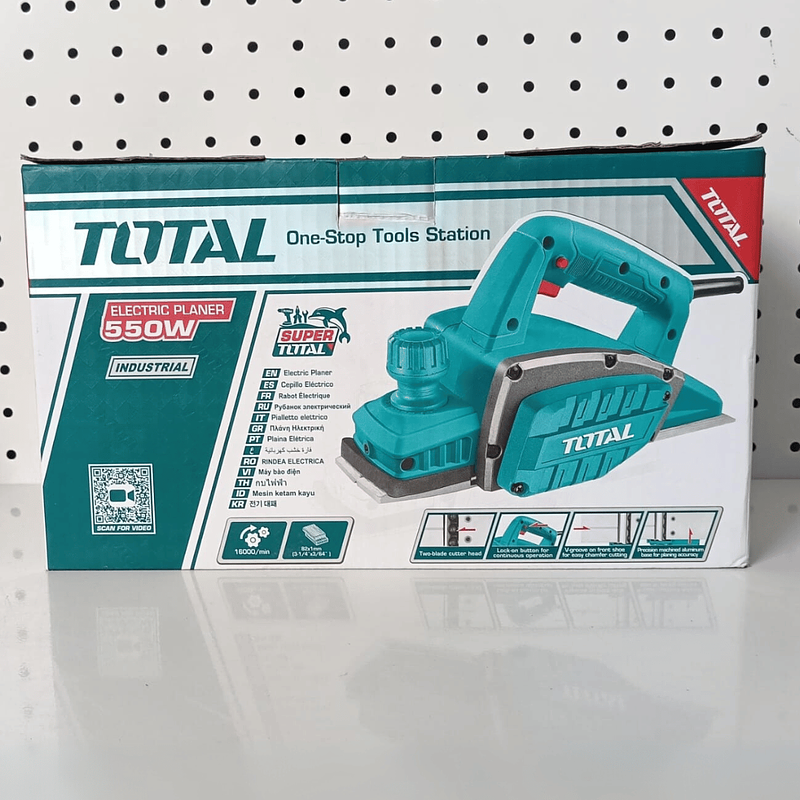 Cepillo Eléctrico TOTAL 550W: potencia y precisión industrial con base de aluminio, ideal para acabados profesionales en carpintería y construcción.