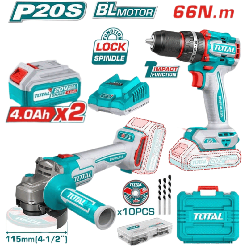 Combo TOTAL 20V: Taladro percutor + esmeriladora angular, 2 baterías, cargador y accesorios. Potencia, durabilidad y versatilidad en un kit.