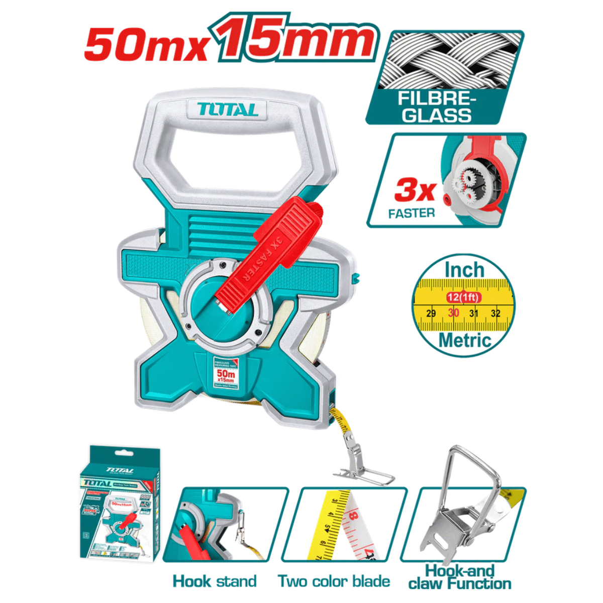 📏 Mide con precisión y seguridad con el Decámetro 50M Industrial Fibra de Vidrio Total.