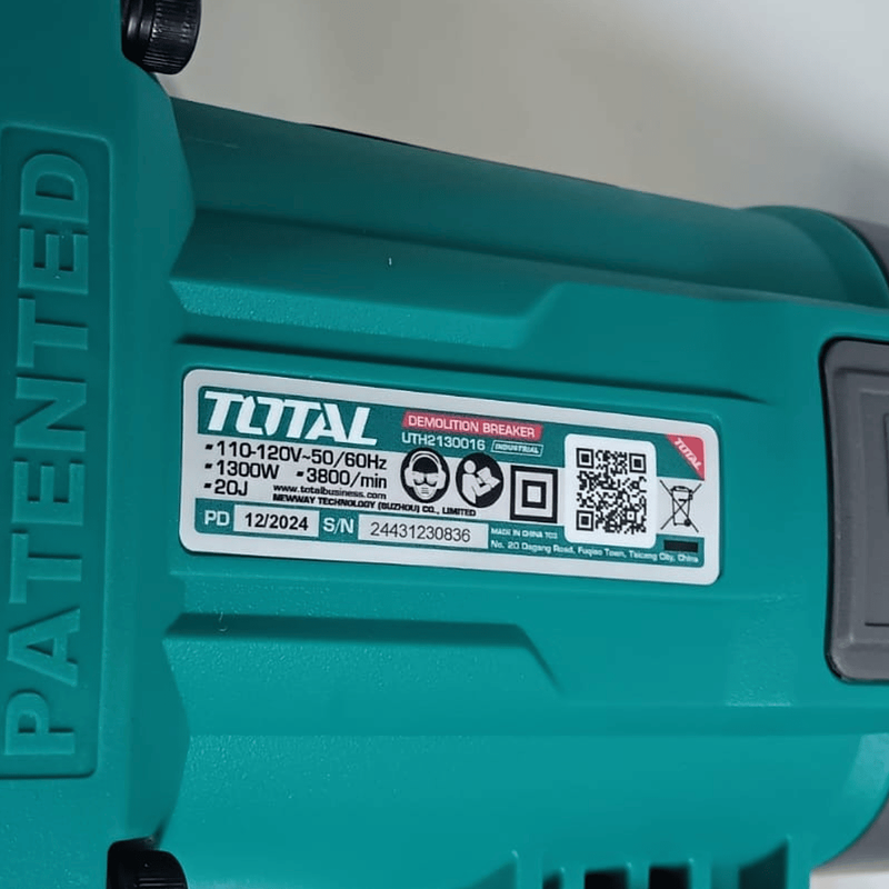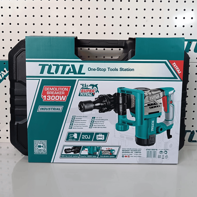 Demoledor TOTAL 1300W 20J Super Select, ideal para romper concreto y estructuras con fuerza industrial, sistema antivibración y mandril HEX