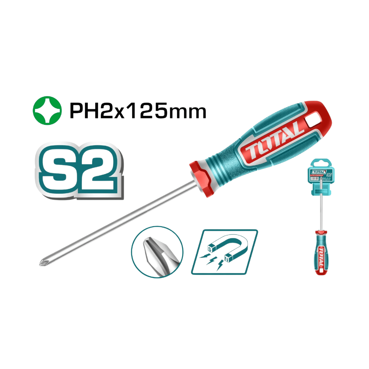 Fabricado con acero S2 de alta calidad, este destornillador Phillips PH2 ofrece una larga vida útil y excelente desempeño en tareas exigentes. Su punta imantada proporciona un agarre firme al tornillo, evitando caídas y mejorando la eficiencia.