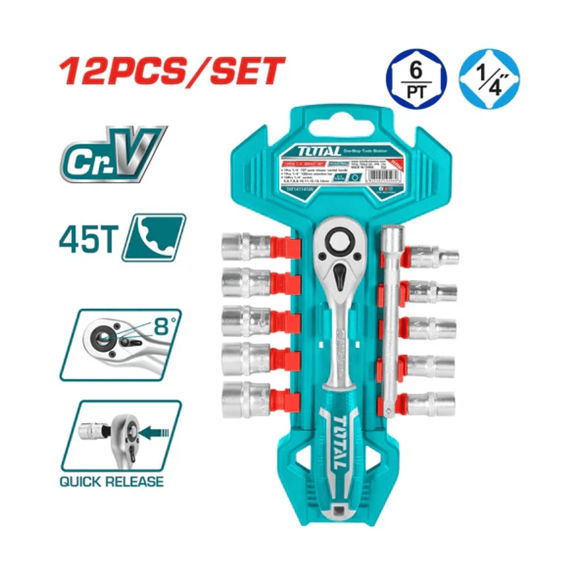 El Juego de Copas con Ratchet 1/4" Total está diseñado para profesionales y aficionados que buscan precisión, comodidad y durabilidad en sus tareas de ajuste. Fabricado en acero Cr-V 50BV30 de alta calidad, este set incluye 10 dados de 5 a 14 mm, un mango ratchet de liberación rápida de 45 dientes (45T) y una barra de extensión cromada de 100 mm, proporcionando flexibilidad y alcance en espacios reducidos sin comprometer la fuerza ni el control.