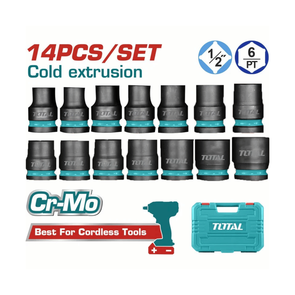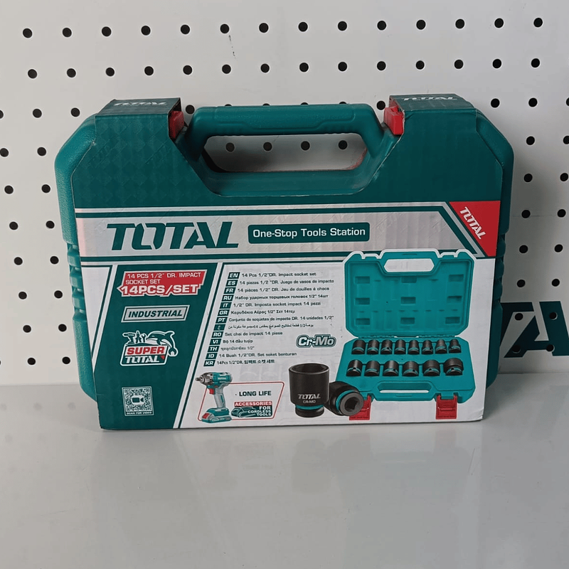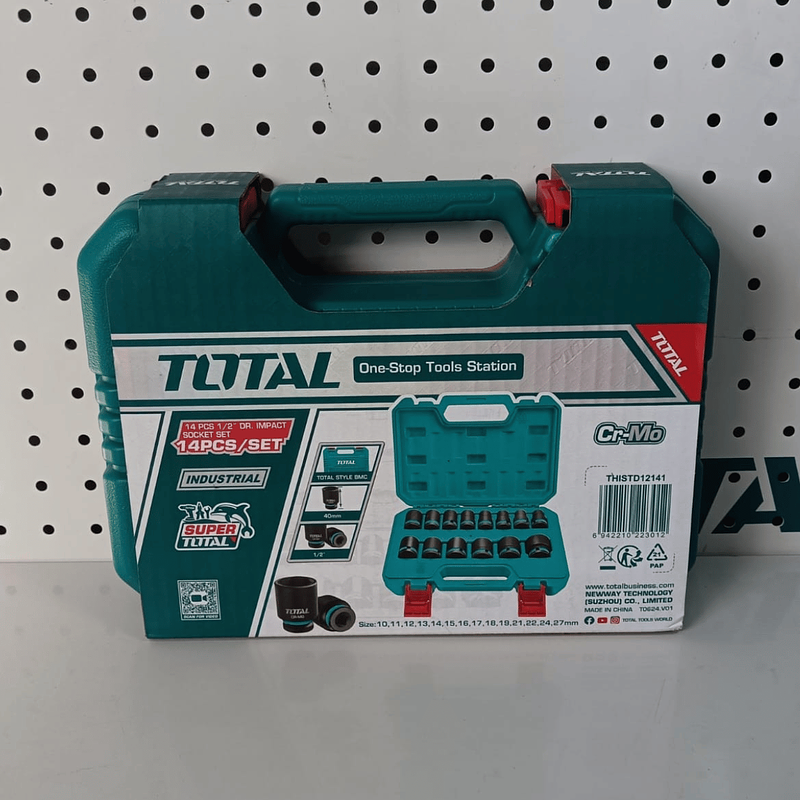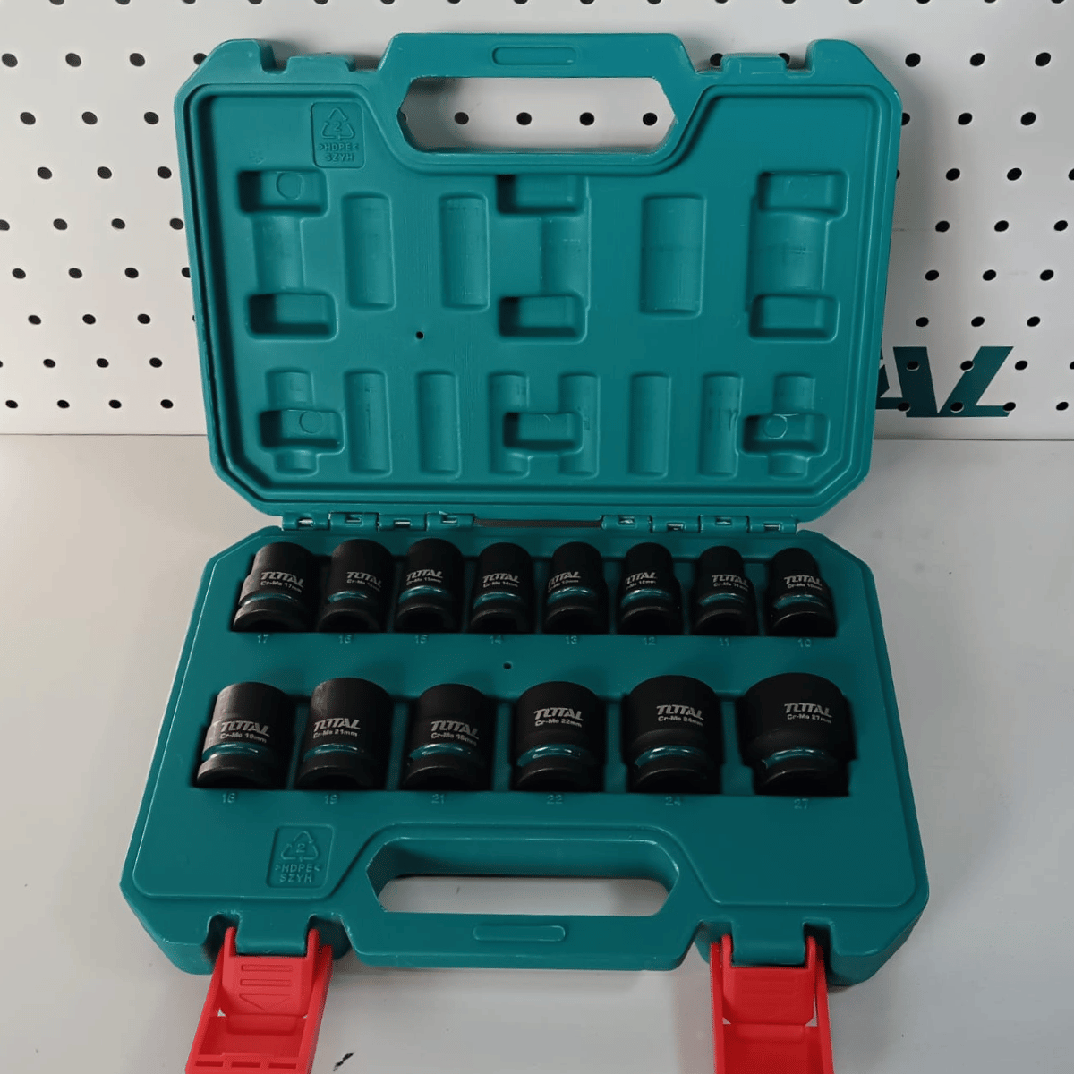 El Juego de Copas CTE 1/2" Total ha sido diseñado para profesionales que exigen precisión, resistencia y rendimiento constante en cada tarea. Con sus 14 piezas de tamaños 10 a 27 mm, este set es perfectamente versátil para trabajos automotrices, industriales y de mantenimiento, asegurando compatibilidad con múltiples modelos de llaves de impacto TOTAL.
