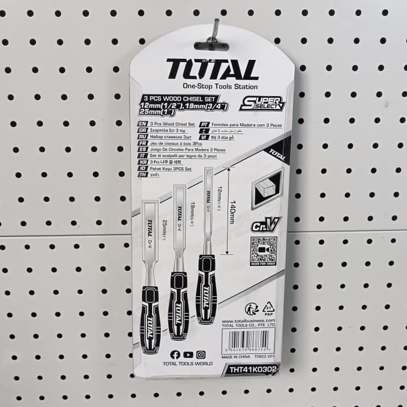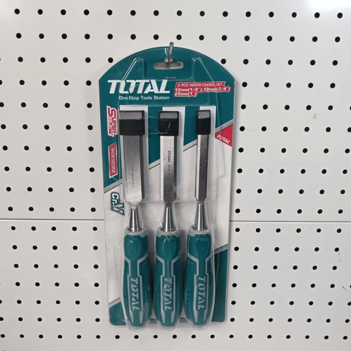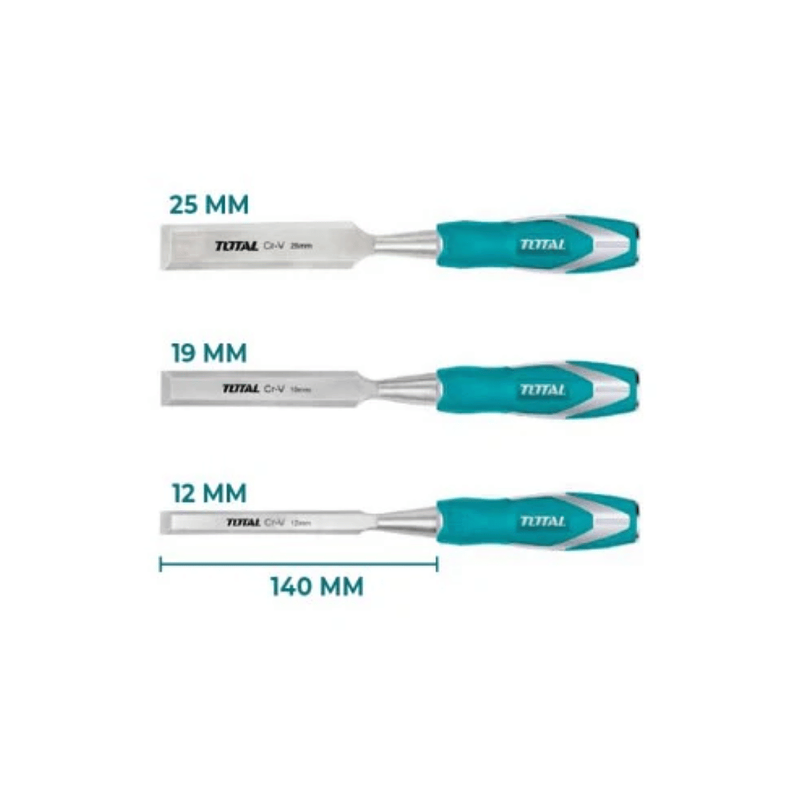 Juego de formones Total de 12-19-25mm, diseño ergonómico, precisión superior y durabilidad. Ideal para acabados profesionales en madera