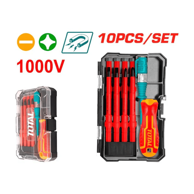 El Juego de Destornilladores Relojero Aislado 10 PZS 1000V TOTAL está diseñado para ofrecer seguridad, precisión y versatilidad en trabajos eléctricos y de detalle. Cada destornillador cuenta con aislación certificada hasta 1000V, protegiendo al profesional contra descargas eléctricas y garantizando un manejo seguro incluso en entornos de alto voltaje.