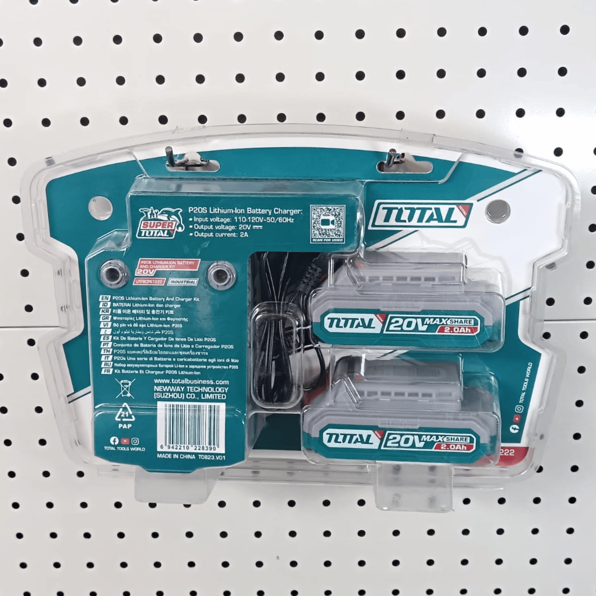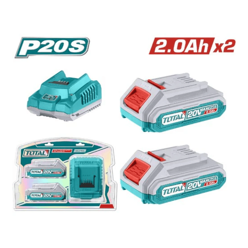 Kit 2 Baterías 2,0Ah + Cargador 20V Industrial Total: energía constante, carga rápida y compatibilidad total con herramientas P20S.