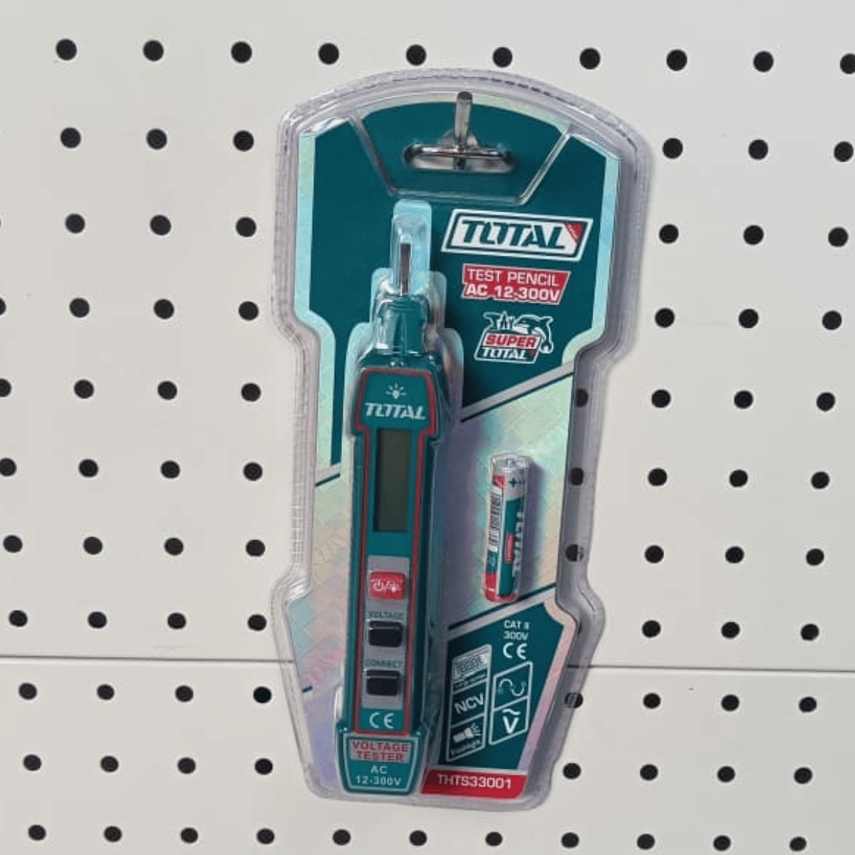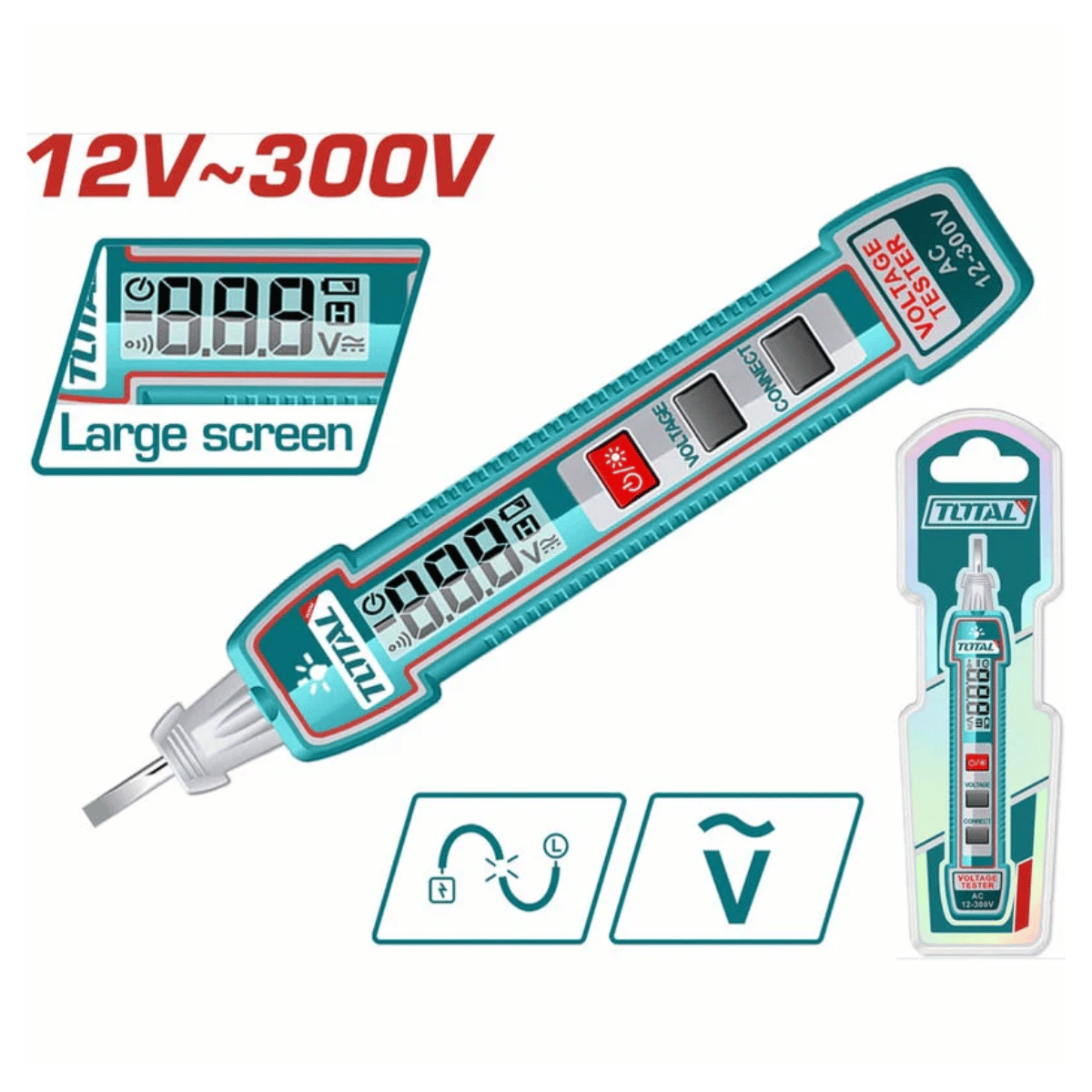 Probador Digital TOTAL 12–300V: diagnóstico rápido y seguro con pantalla LCD, alarma sonora y apagado automático. Precisión industrial portátil.