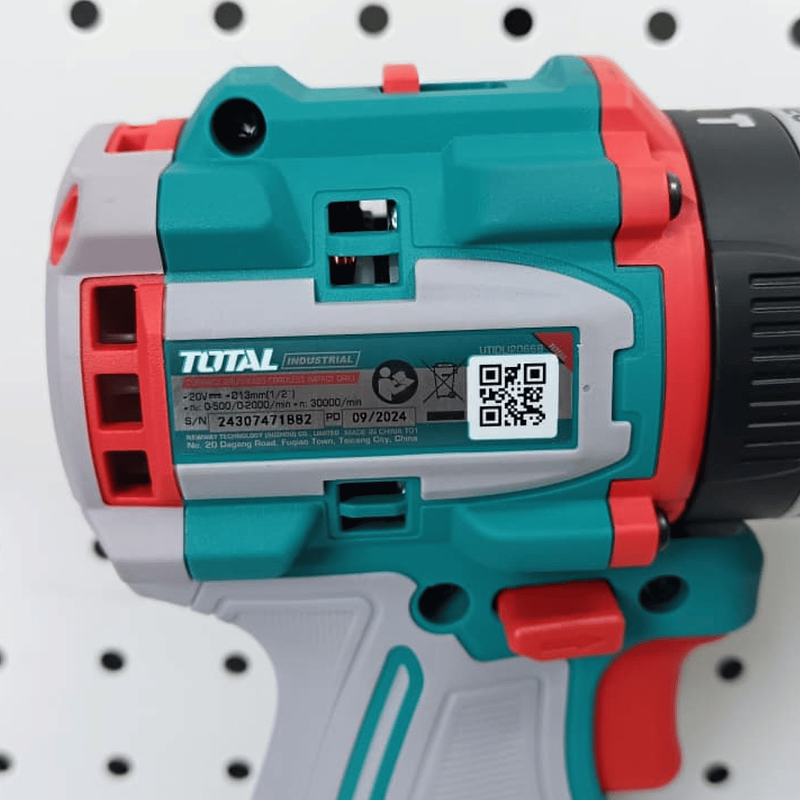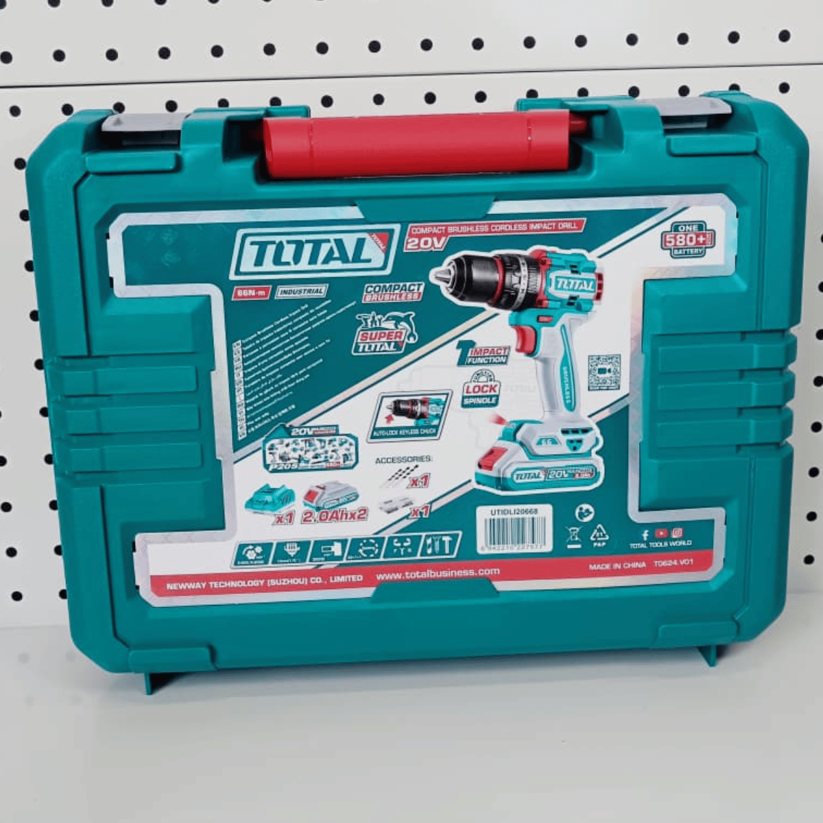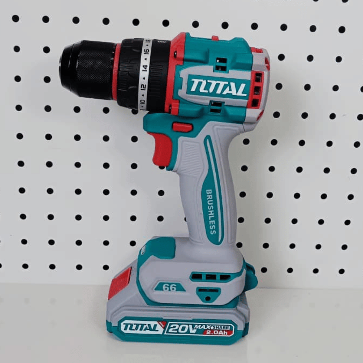 Taladro Percutor TOTAL 20V 1/2", 66 Nm, 2 baterías, percutor, 2 velocidades, ideal para concreto, metal y madera con máxima potencia y precisión.
