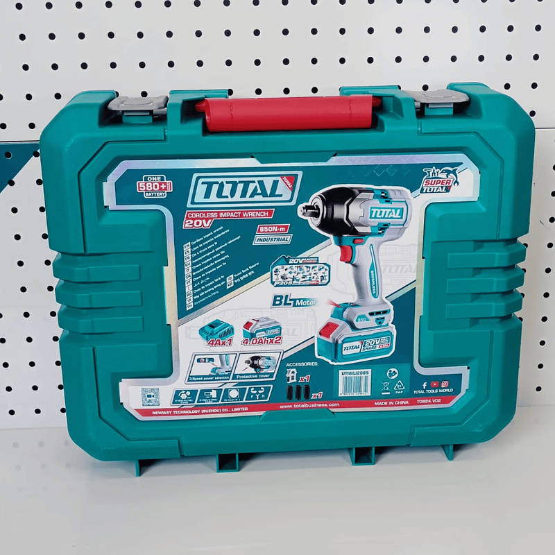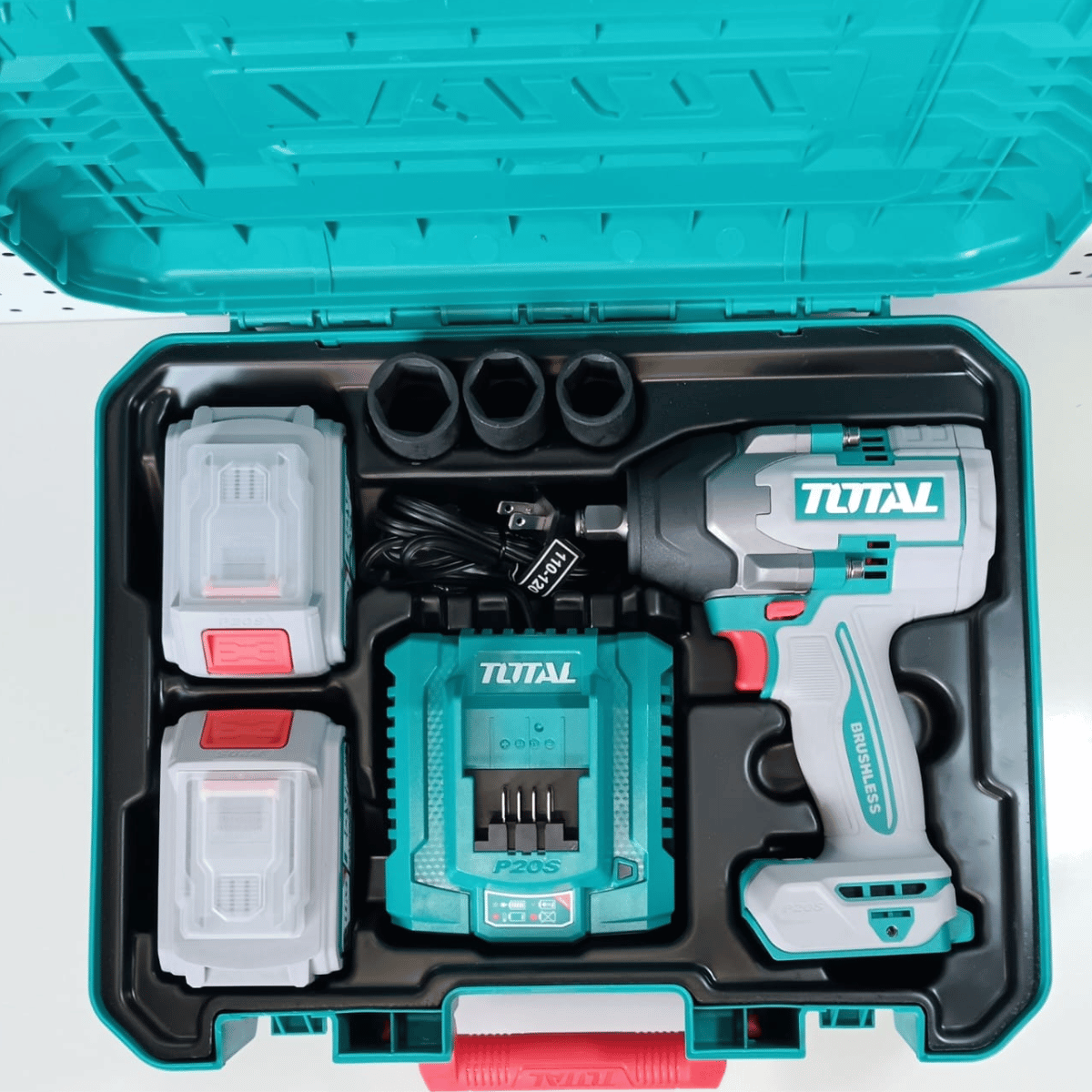 Taladro de Impacto TOTAL 20V 1/2", 850 Nm, motor sin escobillas, 2 baterías 4.0Ah. Máxima potencia para aflojar, apretar y trabajo industriales