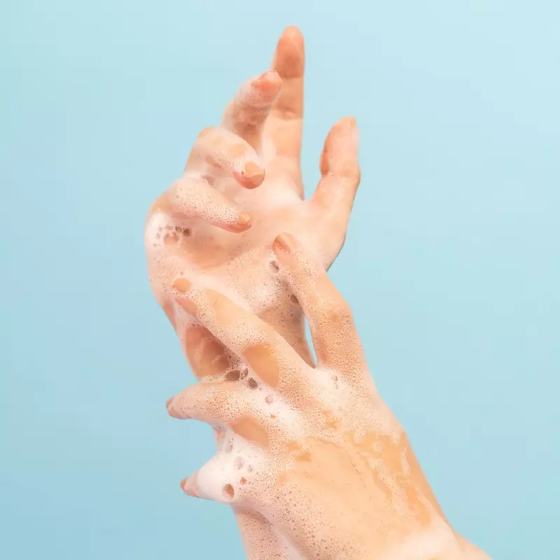 - Frota suavemente hasta formar espuma, asegurándote de limpiar entre los dedos y las muñecas.