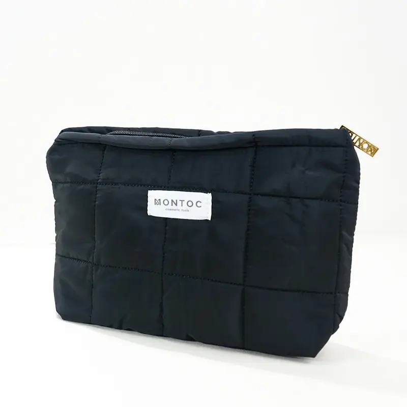 Cosmetiquera negra hecha en tela con forro plástico en el interior, lo que facilita su limpieza. Sus medidas (6 x 16 x 20 cm) ofrecen un buen espacio para organizar productos de diferentes tamaños.