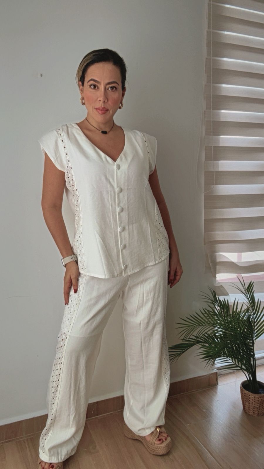 Set blanco con delicado bordado en hojalillo, fresco y elegante. Su diseño ligero y femenino brinda comodidad y un estilo natural encantador.