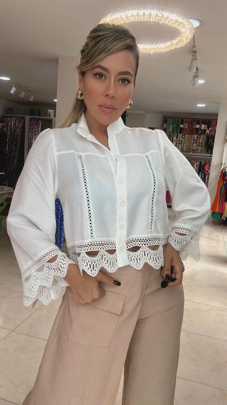 Blusa blanca, manga larga con encaje , caída ligera y femenina, ideal para looks frescos y romántico