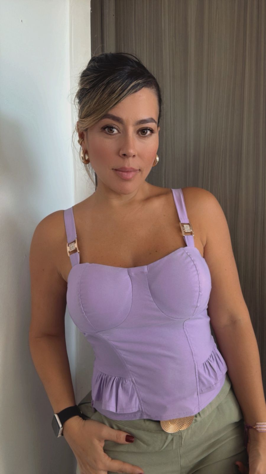 Blusa lila entallada con tiras tipo cinturón, herrajes metálicos y pedrería. Moderna, elegante y perfecta para destacar con un color suave y femenino.
