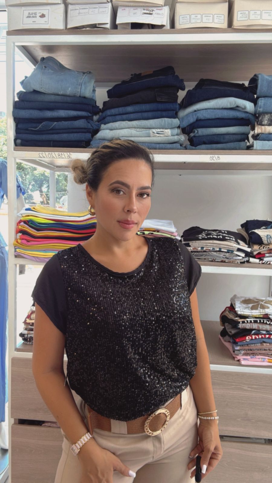 Blusa tipo camisa con lentejuelas, elegante y sofisticada, ideal para destacar en eventos, fiestas o noches especiales.