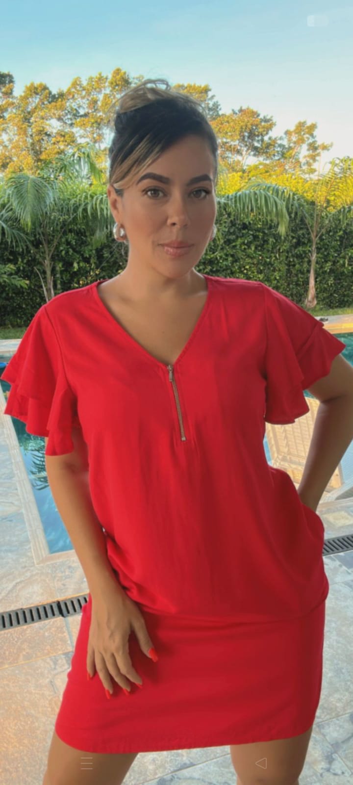 Vestido rojo con escote en V y cremalleras, elegante y sofisticado, perfecto para un look femenino y llamativo en ocasiones especiales.