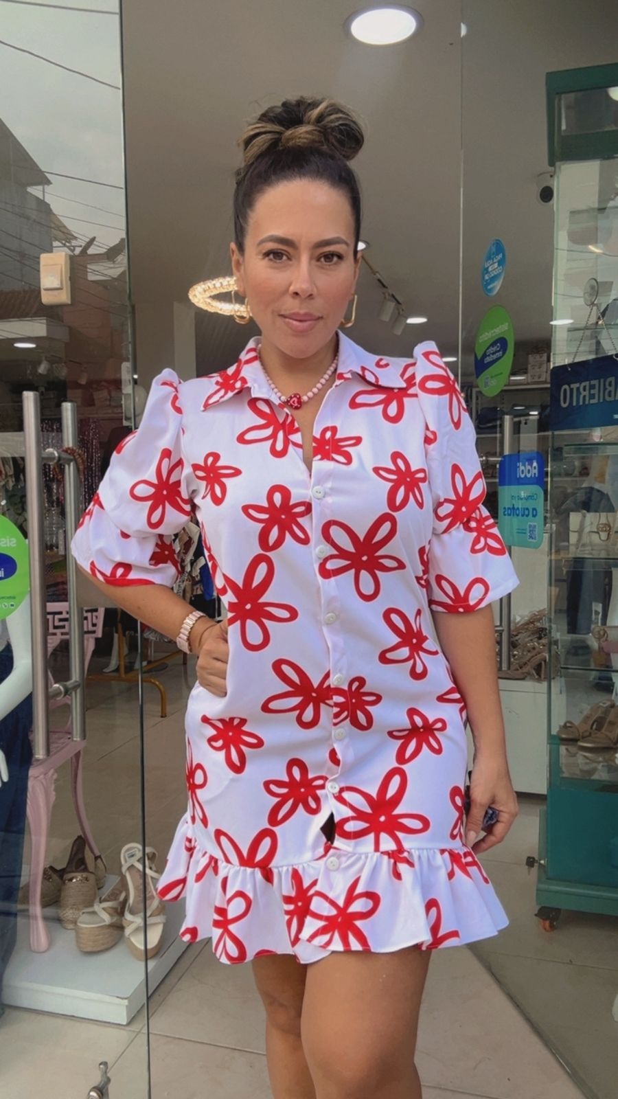 Vestido corto blanco con flores rojas, fresco y femenino. Diseño camisero con botones y volante que estiliza la figura. Ideal para looks casuales