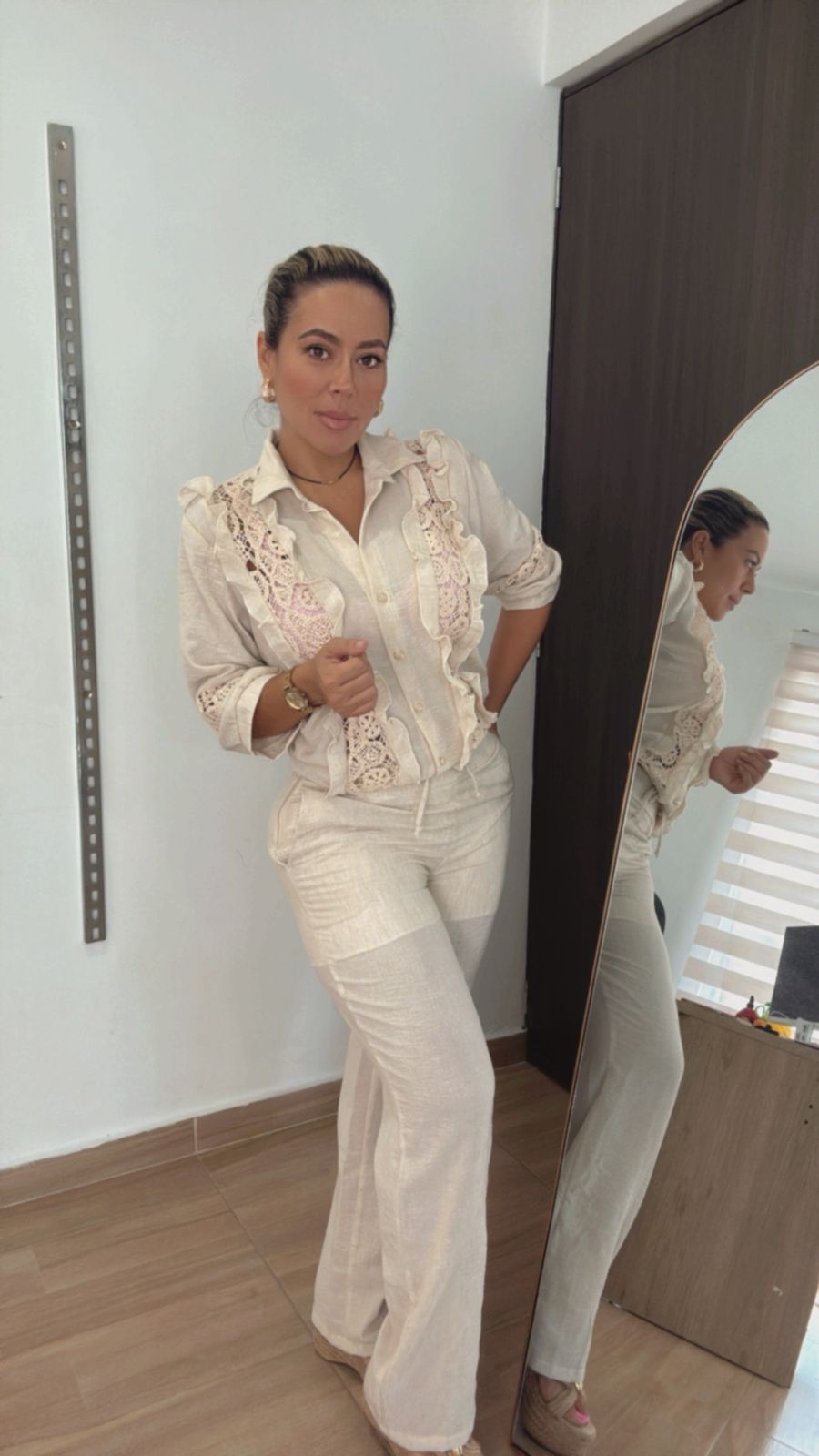 Set beige manga larga bordado, elegante y delicado, ideal para un look femenino y con mucho estilo.