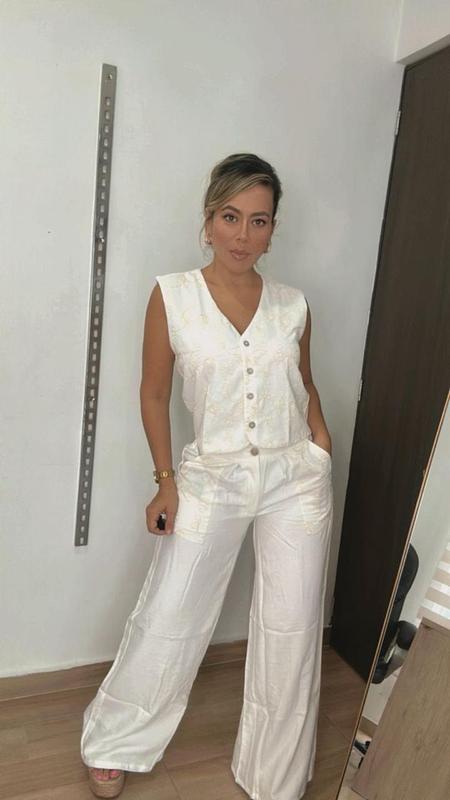 Set en lino con bordado delicado y elegante. Tela fresca, ligera y cómoda, ideal para un look femenino y sofisticado. Perfecto para días cálidos