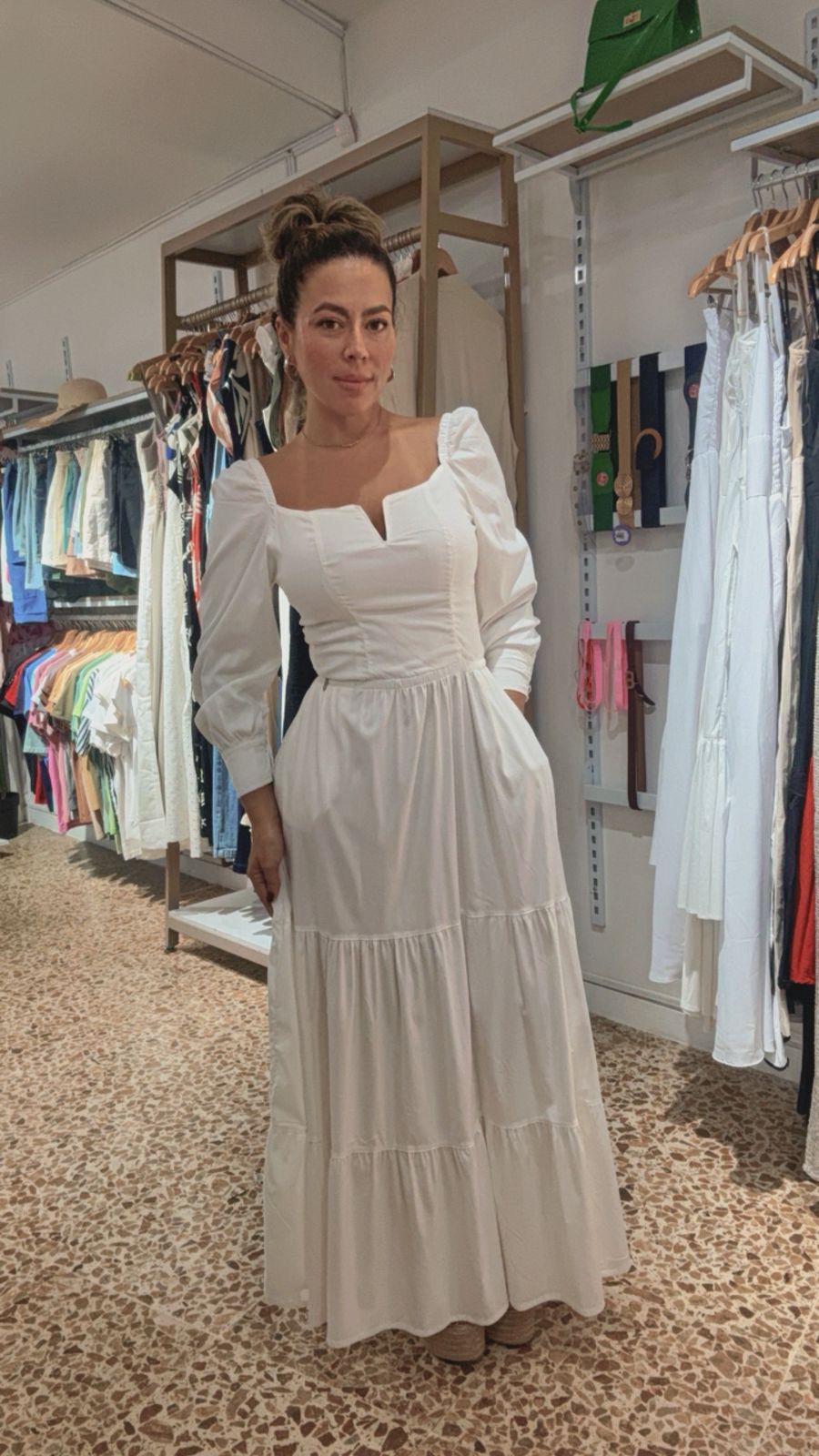 Vestido blanco estilo época con mangas puff, escote recto y pequeña abertura en V. Elegante, romántico y perfecto para eventos especiales, celebracion