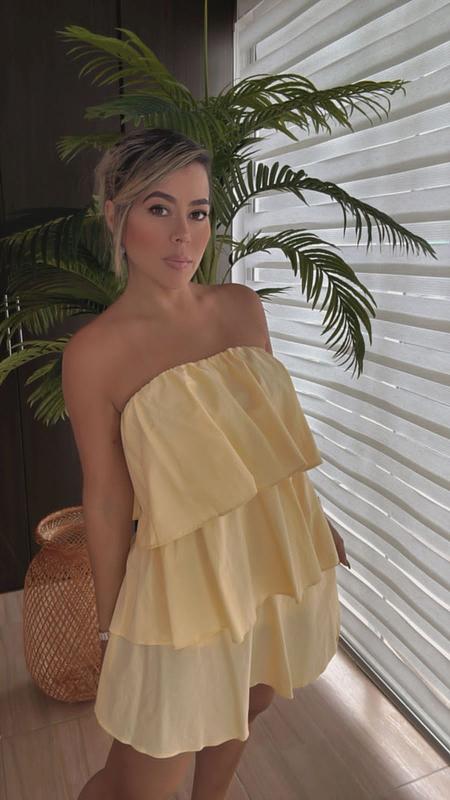 Vestido corto strapless de silueta femenina y fresca, perfecto para días soleados o salidas especiales. Su diseño sin tirantes realza los hombros