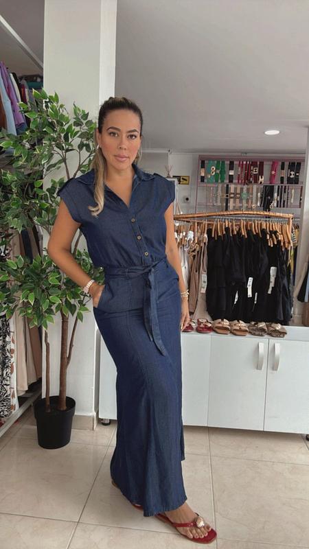 Vestido largo en jean tipo camisero, con botones, bolsillos y cinturón que realzan la figura. Su diseño sin mangas lo hace fresco, hermoso.